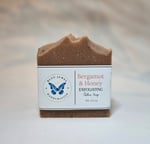 This soap is one of a kind! Crafted with skin-loving tallow, avocado pit puree, golden honey, and finely ground orange peel, it's designed to deeply nourish with a luxurious lather and gently exfoliate, leaving the skin polished and smooth to the touch. Tallow, rich in minerals and vitamins A, D, E, and K, is similar to the natural oils in human skin. Avocado pit brings antioxidants and more vitamin E, while honey - nature's humectant - draws moisture to the skin. Finished with a citrusy bergamot essential oil and honey, this bar is uplifting to the senses and beneficial for your skin.