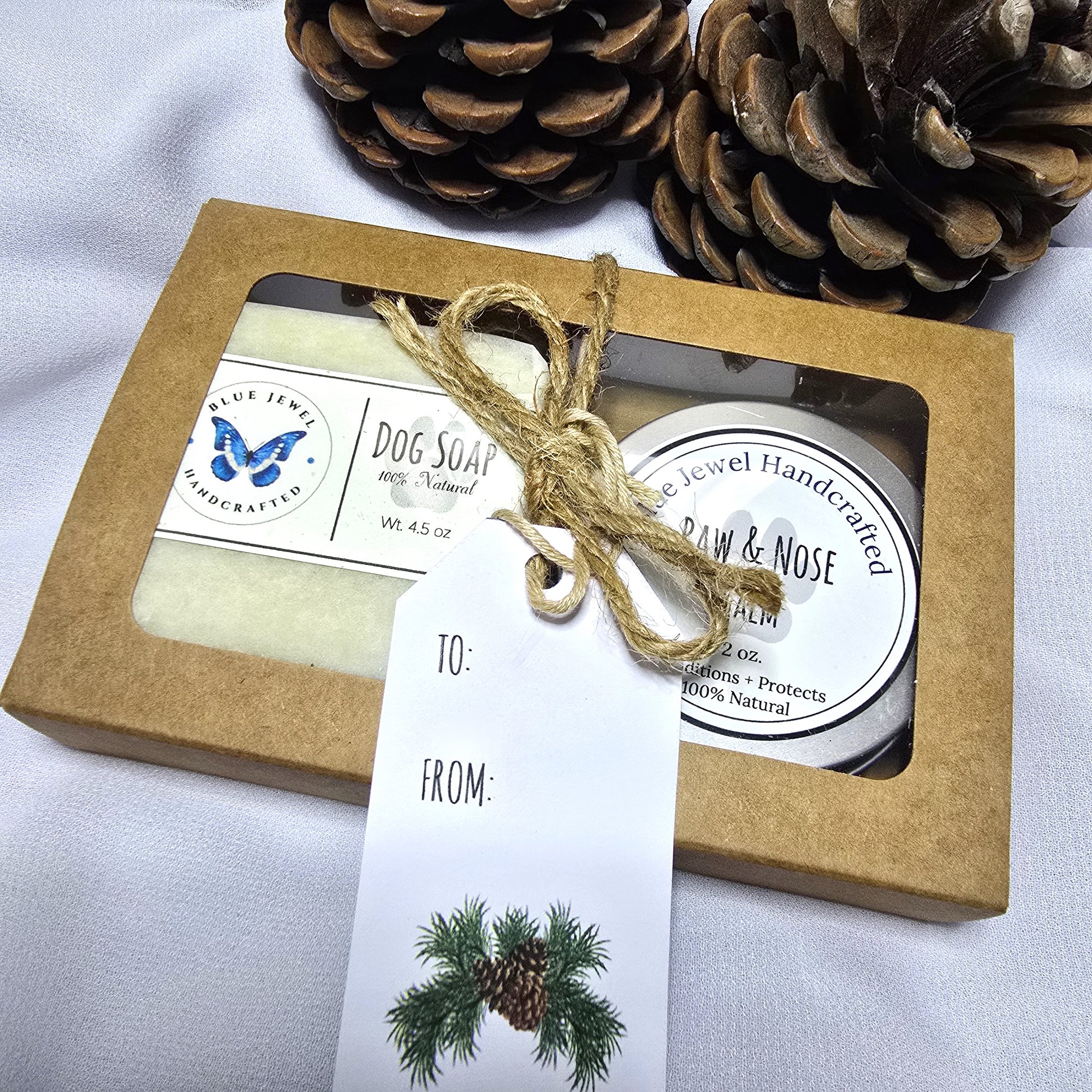 The gentle soap lifts dirt without stripping natural oils, while the rich paw balm provides soothing hydration for tired paws. It comes beautifully packaged, wrapped with twine and a holiday gift tag ready for gifting and ideal for dog birthdays, gotcha days, or holiday surprises.
